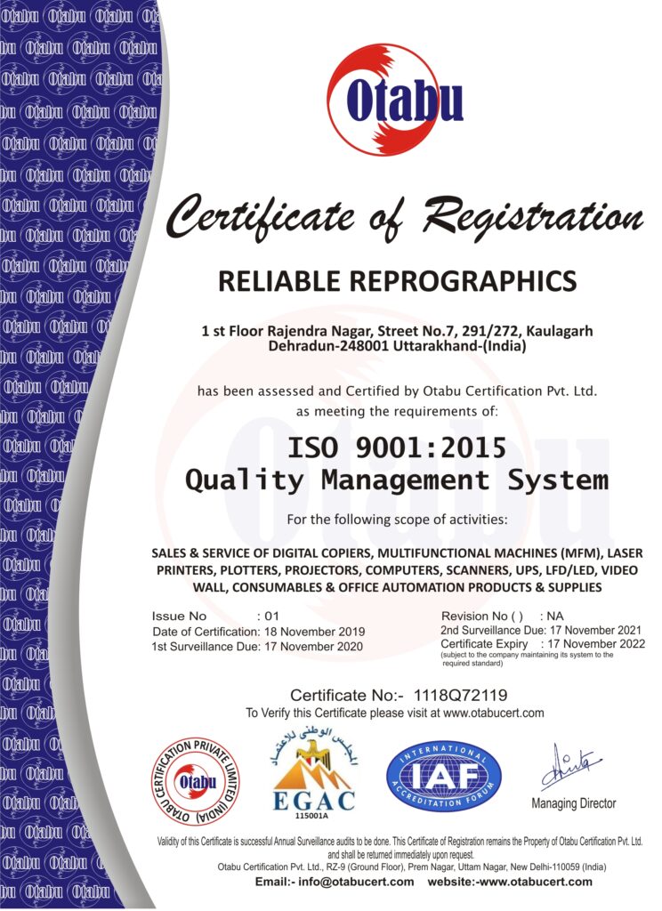 Reliable Reprographics is a trusted ISO 9001:2015 certified company with over two decades of experience in office automation and document solutions. Established in 1999 and headquartered in Dehradun, Uttarakhand, with a branch in Saharanpur, Uttar Pradesh, the company has built a strong reputation for delivering high-quality printing, reprography, and AV equipment across a wide range of industries.